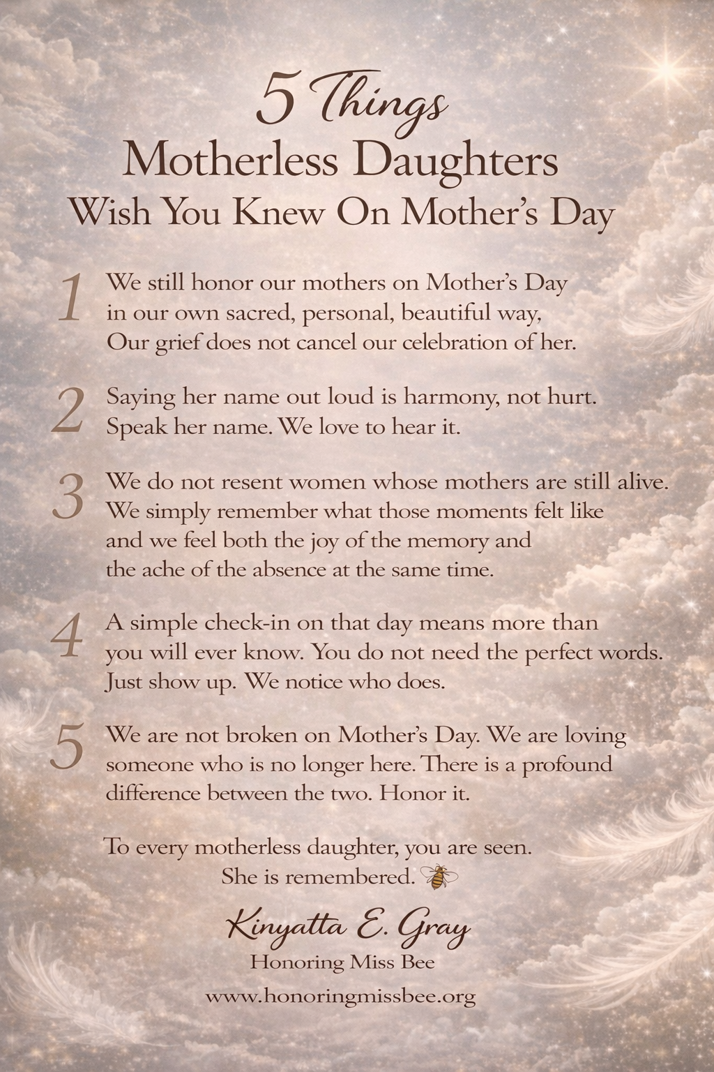 If you’re here, chances are you’ve lost your mother and nothing has felt the same since. I created Honoring Miss Bee as a place to tell the truth about that kind of loss and about what happens after the breaking. This isn’t about fixing grief or rushing healing. It’s about being witnessed as you learn how to live, love, and find joy again while still carrying your mother with you.